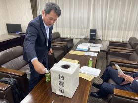写真は抽選する永岡理事長。ご当選された方には事務局より連絡を差し上げます。